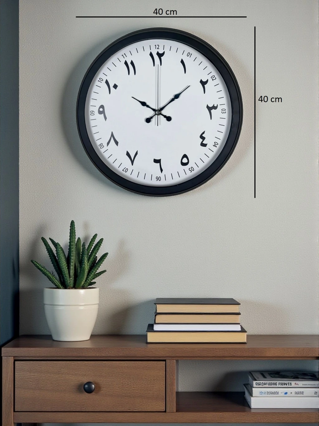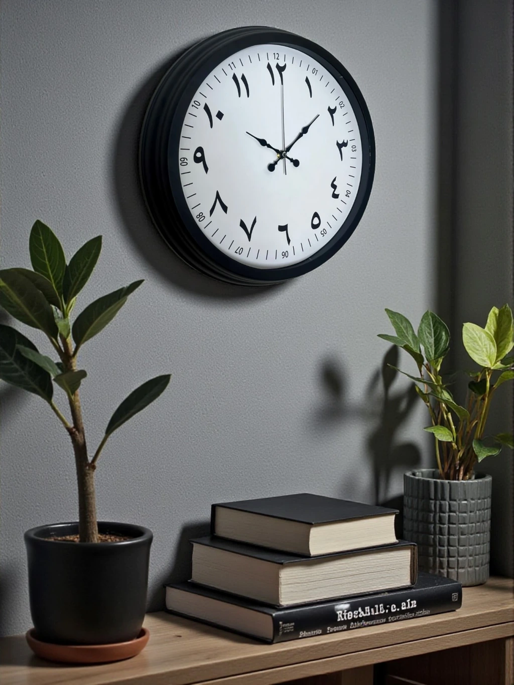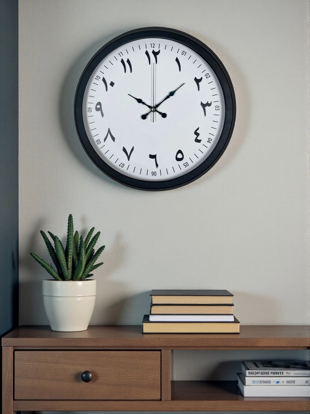 Klasik duvar saatlerinden farklı olarak Arap rakamları (Doğu Arap numeralleri) ile tasarlanan bu özel model, zamana kültürel bir anlam ve estetik bir derinlik kazandırır. Beyaz kadran üzerinde yer alan siyah Arap rakamları, hem güçlü bir görsellik sunar hem de saatin kolay okunmasını sağlar. Bu özelliğiyle klasik rakamlı saatlerden ayrılır ve bulunduğu ortama özgün bir karakter katar.