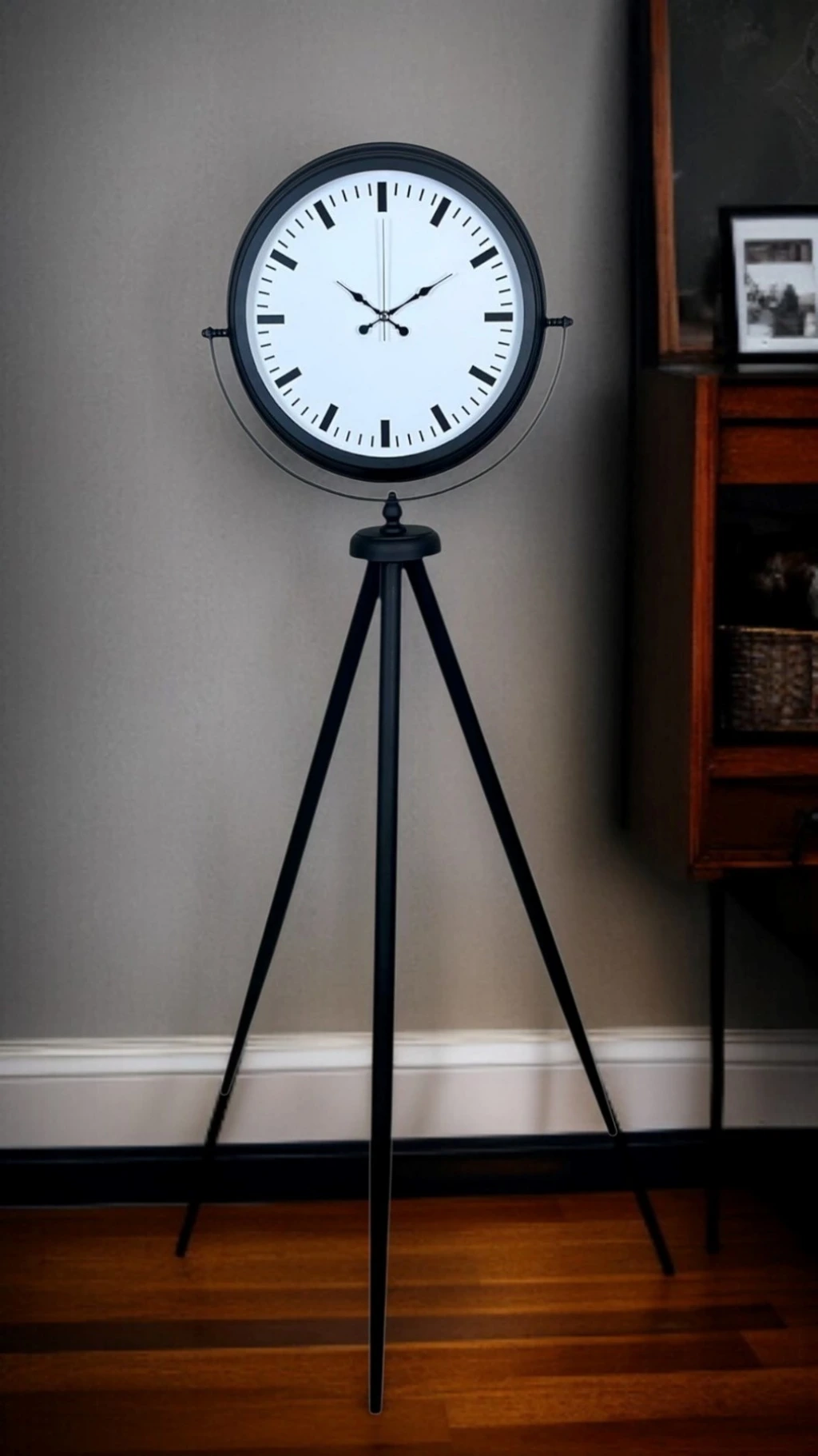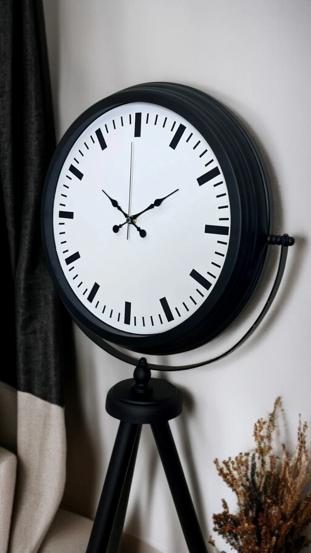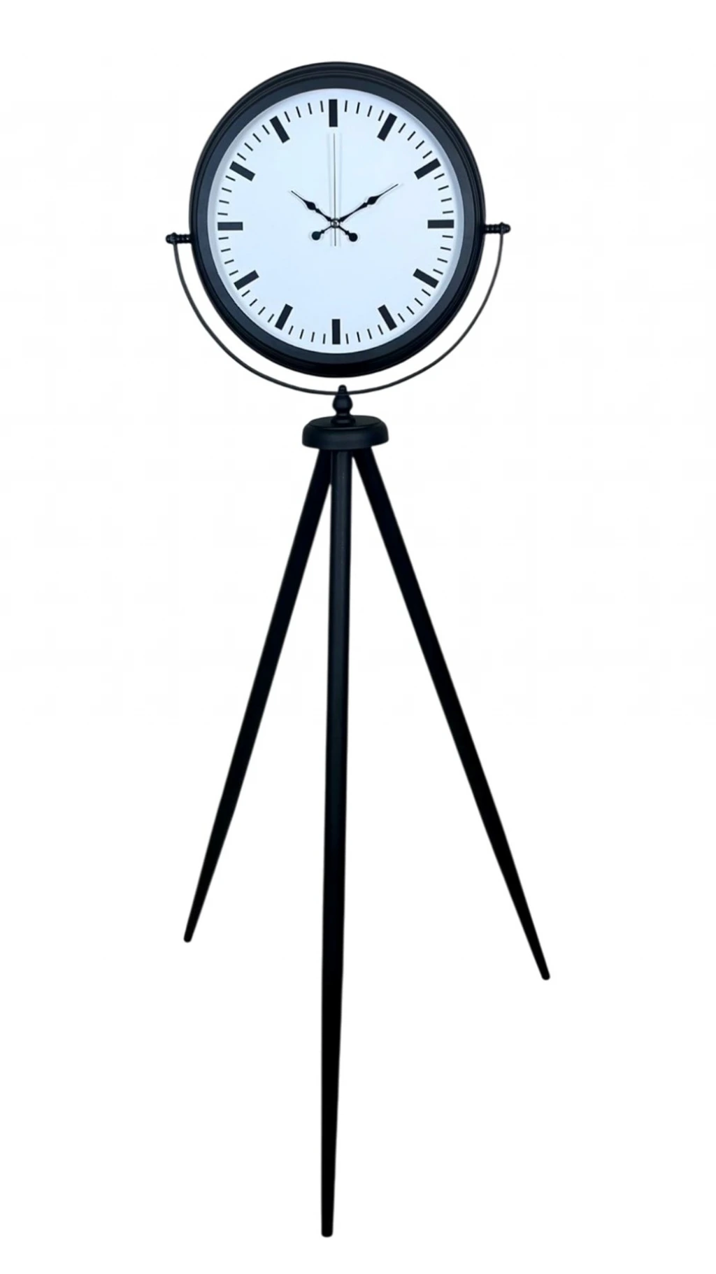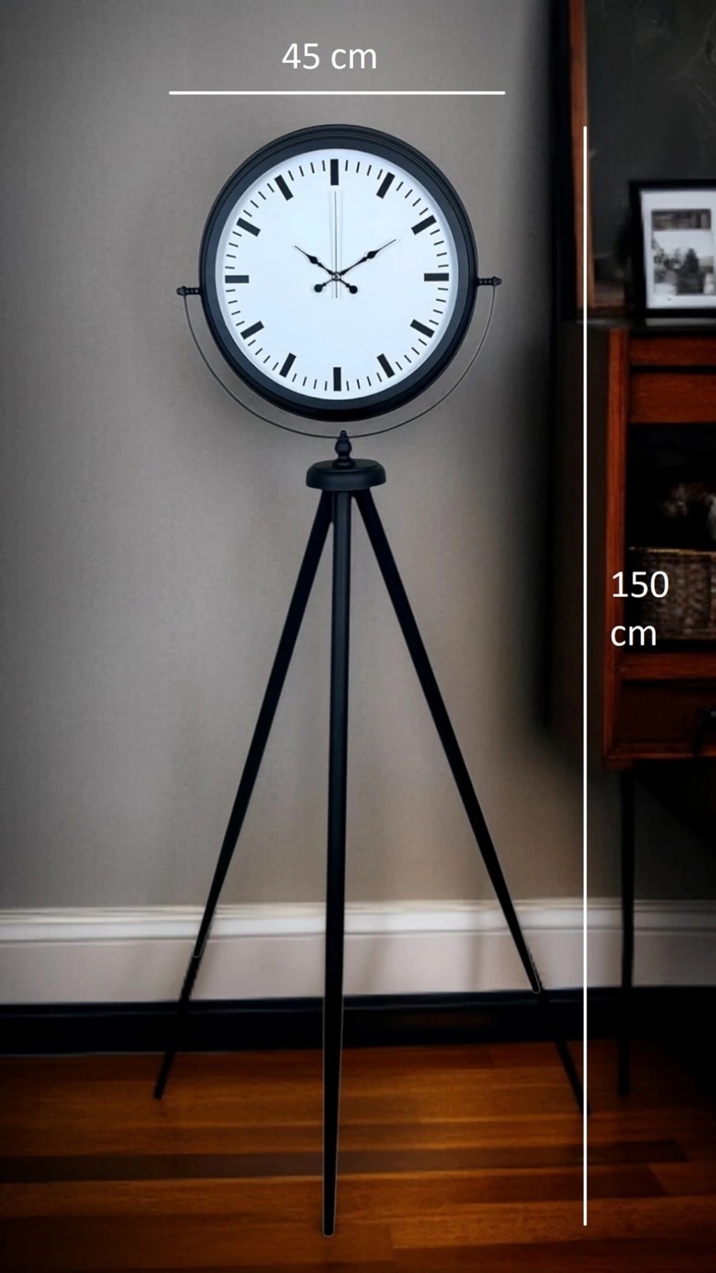 Modern ve sade dekorasyonu sevenler için tasarlanan Siyah Tripod Ayaklı Dekoratif Salon Saati, 150 x 45 cm ölçüsüyle yaşam alanlarında güçlü bir stil etkisi oluşturur. Siyah metal tripod ayak formu, ürüne hem şık hem de dengeli bir duruş kazandırırken; beyaz kadran üzerindeki modern indeks (çubuk) göstergeler minimal ve premium bir görünüm sunar. Rakam kalabalığından uzak, temiz ve net tasarımı sayesinde bu model; modern, loft ve endüstriyel dekorasyon stillerine kusursuz uyum sağlar.
