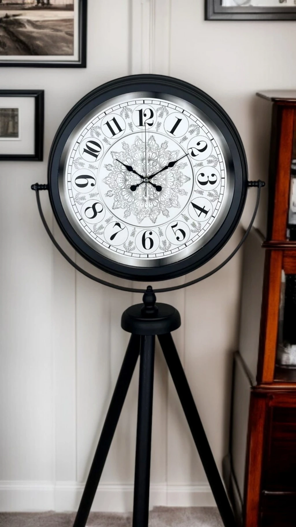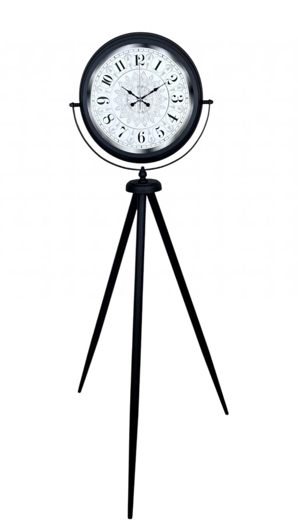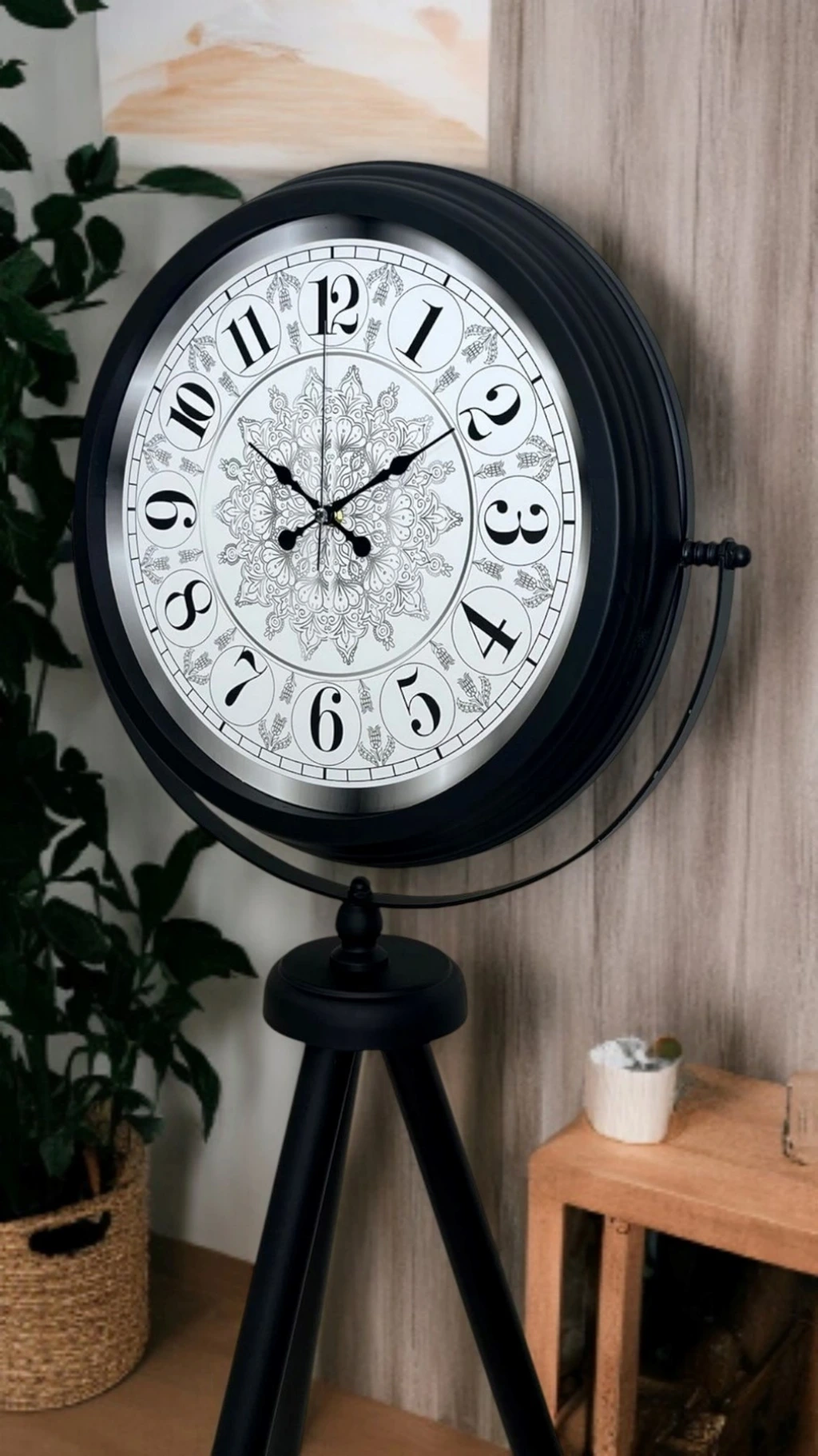 Zamansız tasarımı, güçlü duruşu ve dikkat çekici formu ile siyah tripod ayaklı dekoratif saat, klasik ve modern dekorasyonu bir araya getiren özel bir tasarım ürünüdür. Sıradan duvar veya masa saatlerinden farklı olarak ayaklı formu sayesinde bulunduğu ortamda dekoratif bir odak noktası oluşturur.