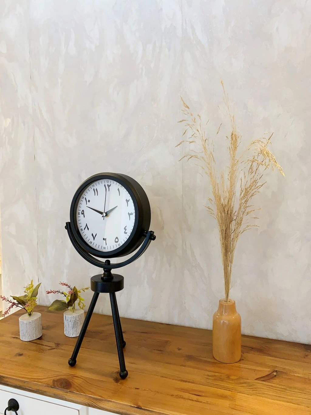 Şık ve modern tasarımıyla dikkat çeken  siyah fırın boyalı  mini tripod masa saatimiz, sessiz akar saniye mekanizmasıyla konforlu bir kullanım sunar. Gerçek cam koruma paneli sayesinde uzun ömürlü ve dayanıklıdır. Estetik görünümüyle hem ev hem de iş yerleri için ideal bir dekoratif üründür.