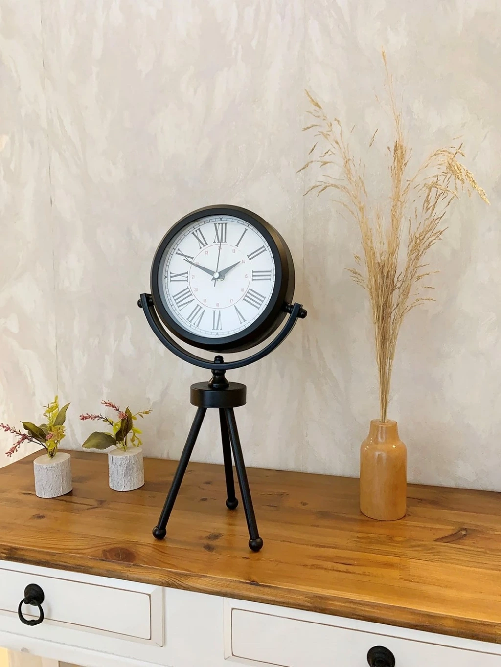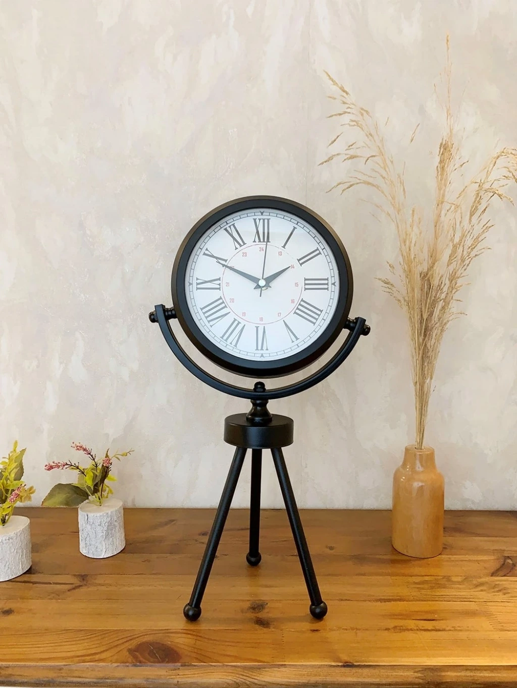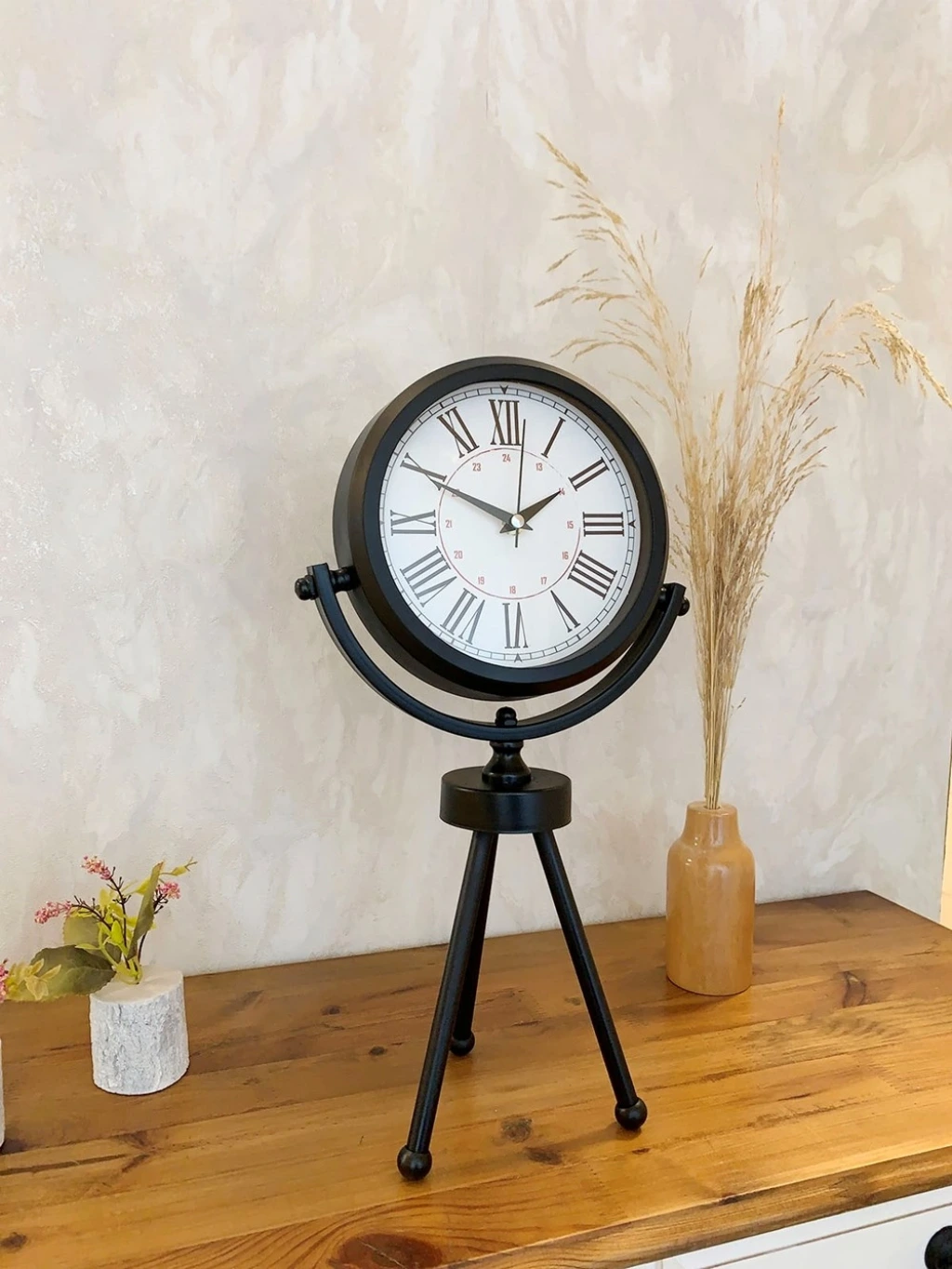 Şık ve modern tasarımıyla dikkat çeken  siyah fırın boyalı  mini tripod masa saatimiz, sessiz akar saniye mekanizmasıyla konforlu bir kullanım sunar. Gerçek cam koruma paneli sayesinde uzun ömürlü ve dayanıklıdır. Estetik görünümüyle hem ev hem de iş yerleri için ideal bir dekoratif üründür.