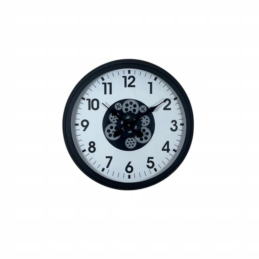Orta bölümde yer alan hareketli çark mekanizması saate dinamik ve dikkat çekici bir görünüm sunar. Modern tasarımı mekanik detaylarla buluşturan bu model, hem dekoratif hem fonksiyonel bir üründür.