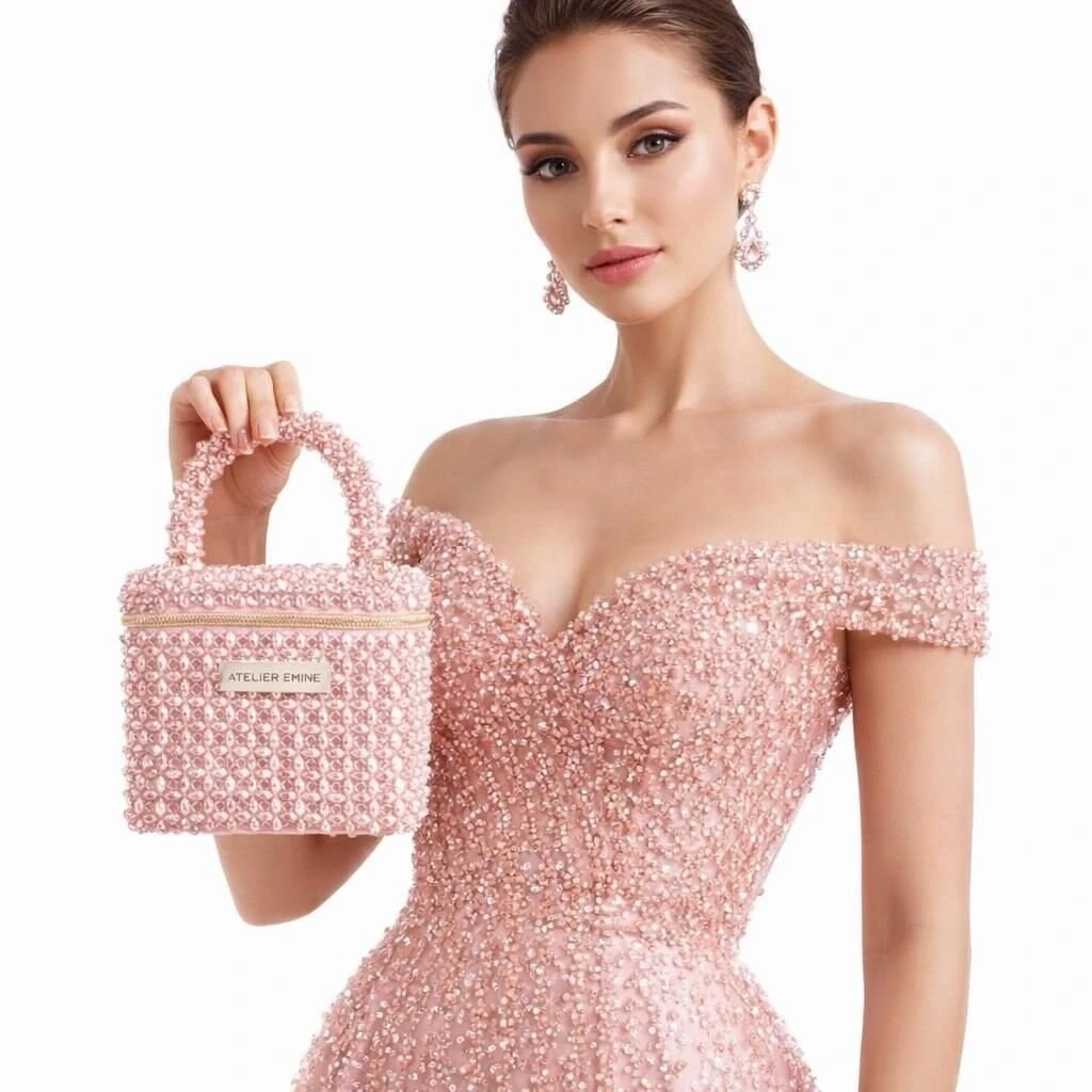 Atelier Emine’in Crystal Gelato Couture serisine ait bu tasarım; 8 mm optik sınıfı kristal boncuklar kullanılarak, tamamen el işçiliğiyle üretilmiş box formda premium mini çanta modelidir.
