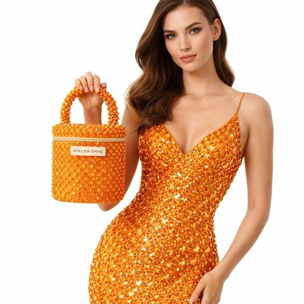 Kristal boncuklar, yüzeyde maksimum ışık kırılımı sağlayacak şekilde yoğun ve düzenli bir örgü yapısıyla tek tek işlenmiş; gövde, silindirik ve dikey hatlarda yapılandırılarak yüksek form stabilitesi elde edilmiştir. Kristal örgü, çantanın tüm yüzeyinde homojen bir doku sürekliliği sunar.