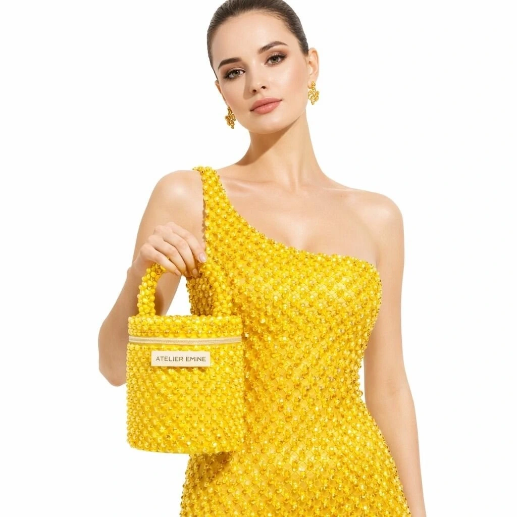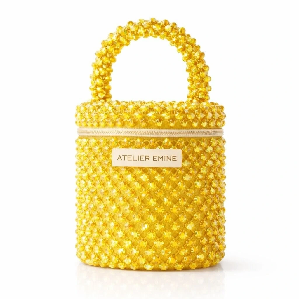 Atelier Emine’in Crystal Gelato Couture serisine ait Sorbetto Lemon, 8 mm optik sınıfı kristal boncukların yüksek dayanımlı misina ile örülmesiyle tamamen el işçiliğiyle üretilmiş, mimari netlikte formu olan premium mini çanta modelidir.