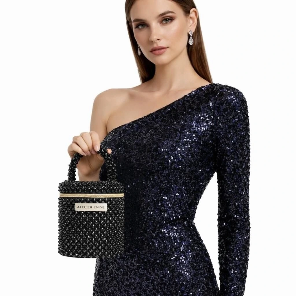 Kristal boncuklar, yüzeyde maksimum ışık kırılımı sağlayacak şekilde yoğun ve düzenli bir örgü yapısıyla tek tek işlenmiş; gövde, silindirik ve dikey hatlarda yapılandırılarak yüksek form stabilitesi elde edilmiştir. Kristal örgü, çantanın tüm yüzeyinde homojen bir doku sürekliliği sunar.