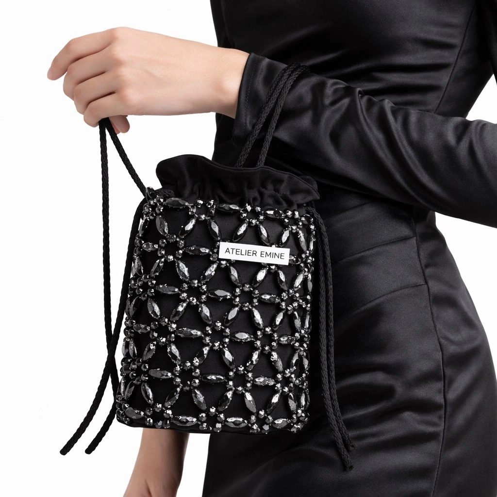 Kristal boncuklar, yüzey boyunca düzenli ve ritmik bir ağ örgü sistemiyle tek tek işlenmiş; bu yapı, ışığın çok yönlü kırılımını sağlayarak çantaya derinlikli ve canlı bir yüzey etkisi kazandırmıştır. Örgü sistemi, esnekliği korurken formun sarkmasını engelleyecek şekilde dengelenmiştir.