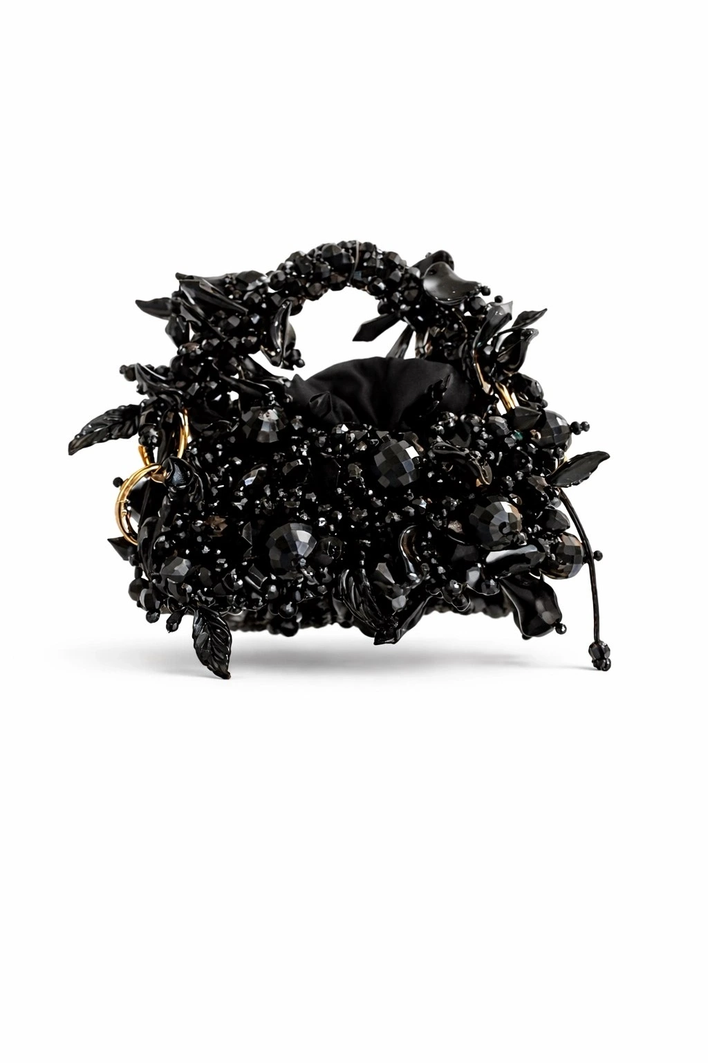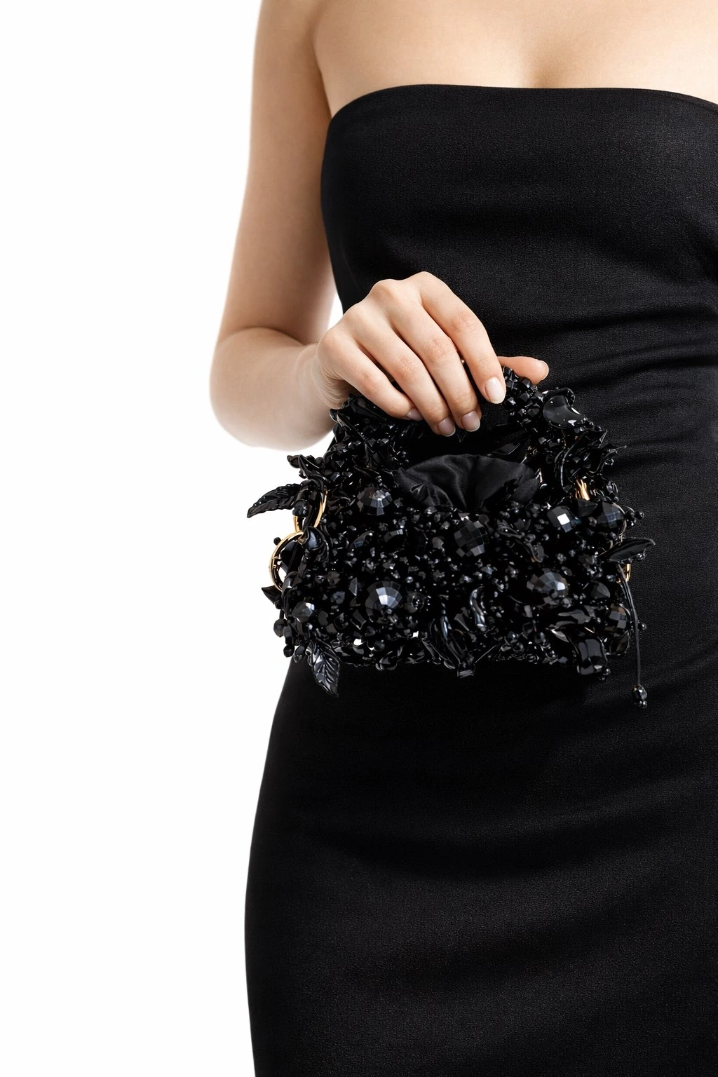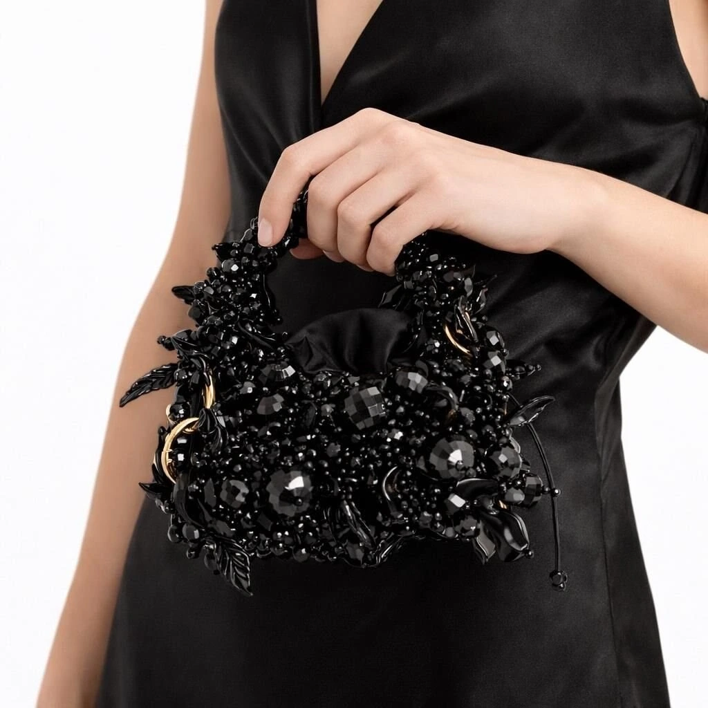 Gövde yapısı, farklı kesim ve hacimlerde kristal boncukların yüksek dayanımlı misina ile tek tek örülmesiyle oluşturulmuş; yüzey boyunca kontrollü düzensizlik prensibiyle ilerleyen üç boyutlu bir doku elde edilmiştir. Bu teknik, çantaya ışık altında canlı fakat doğal bir kırılma etkisi kazandırırken, yüzeyde monotonluğu kıran couture düzeyinde bir derinlik sunar.