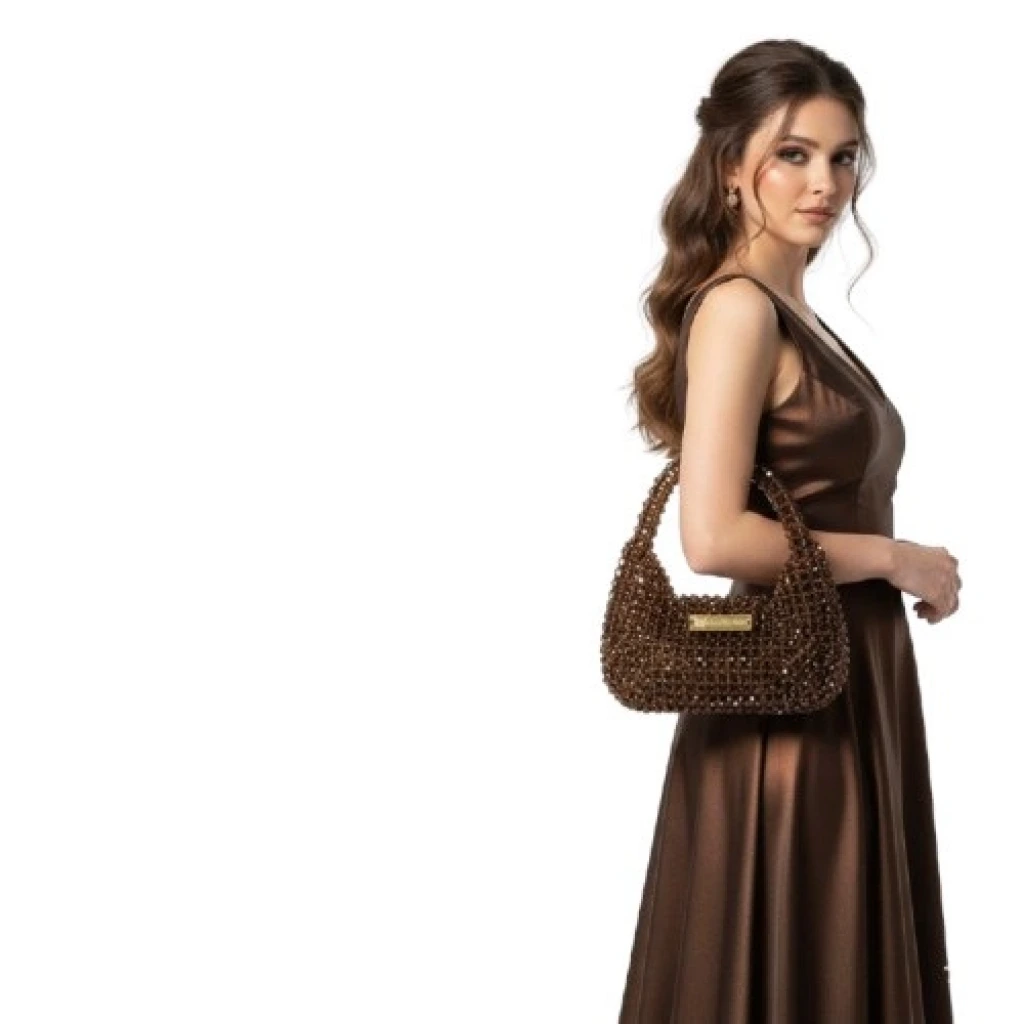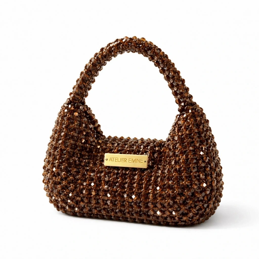 Üst taşıma kulpu, gövdeyle tek parça halinde kristal örgüden oluşturulmuş olup, elde taşıma ergonomisini destekleyen kavisli form ve dengeli kalınlığa sahiptir. Kulplu yapı, çantanın genel akışkan formunu koruyacak şekilde gövdeyle bütünleşir.