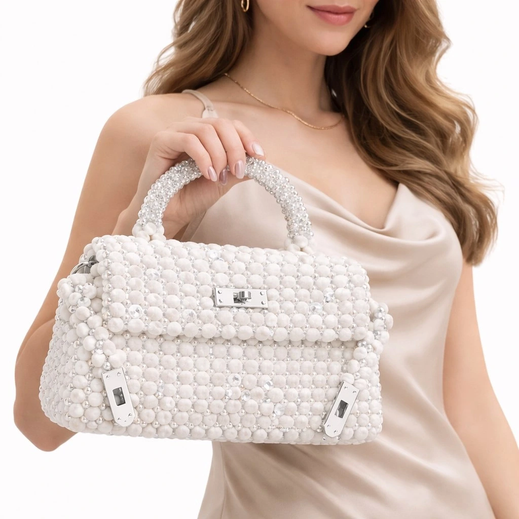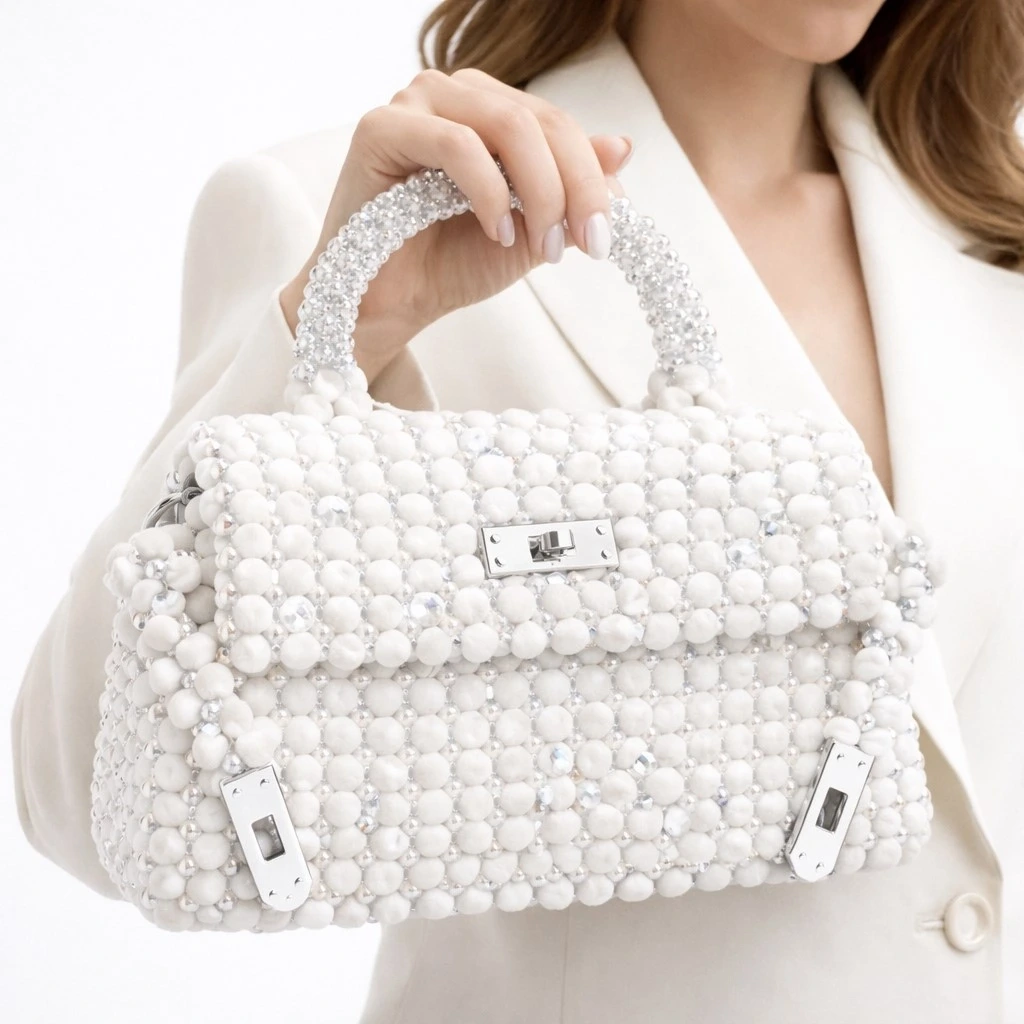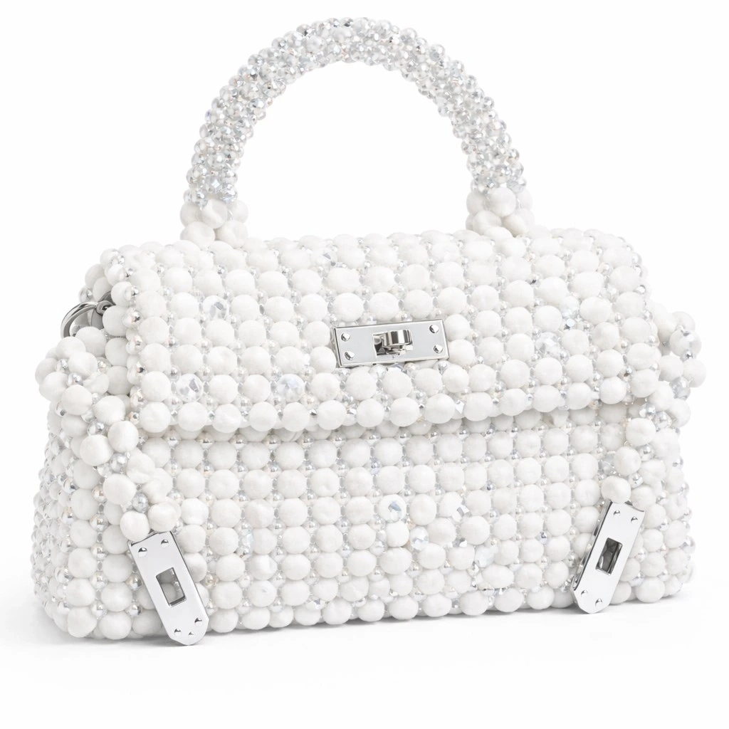 Gövde formu, kadife boncuk örgünün doğal akışını koruyacak şekilde dengelenmiş; aynı zamanda kristal boncukların ağırlığını taşıyabilmesi için içten yapısal destekle güçlendirilmiştir. Misina örgü tekniği sayesinde çanta yüzeyi dikişsiz, kesintisiz ve heykelsi bir bütünlük sunar.