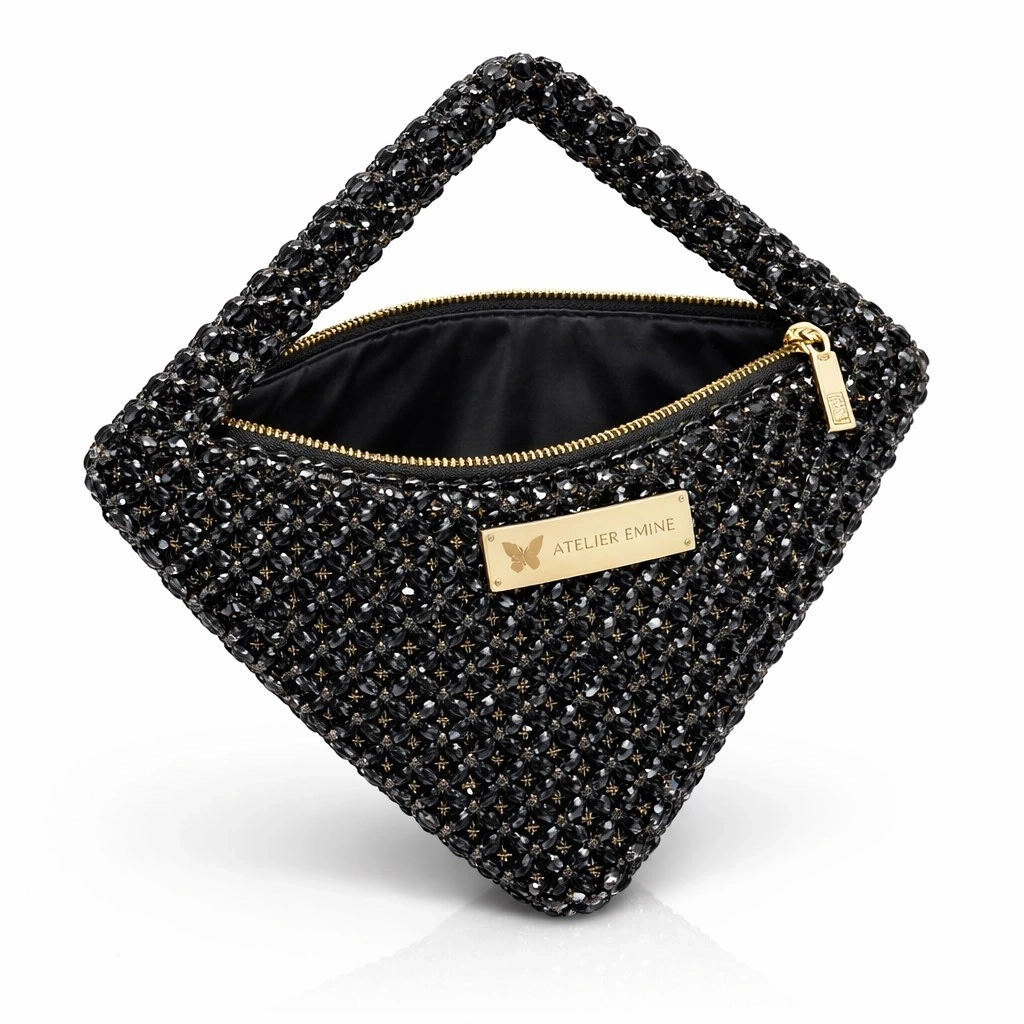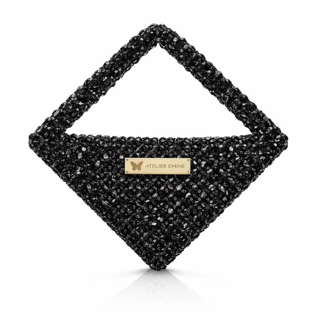 Atelier Emine’in Crystal Gelato Couture serisine ait bu tasarım; 8 mm optik sınıfı kristal boncuklar kullanılarak, tamamen el işçiliğiyle üretilmiş geometrik formlu premium mini çanta modelidir.