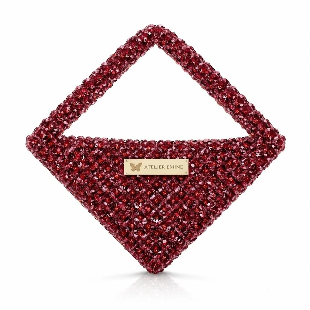Atelier Emine’in Crystal Gelato Couture serisine ait bu tasarım; 8 mm optik sınıfı kristal boncuklar kullanılarak, tamamen el işçiliğiyle üretilmiş geometrik formlu premium mini çanta modelidir.
