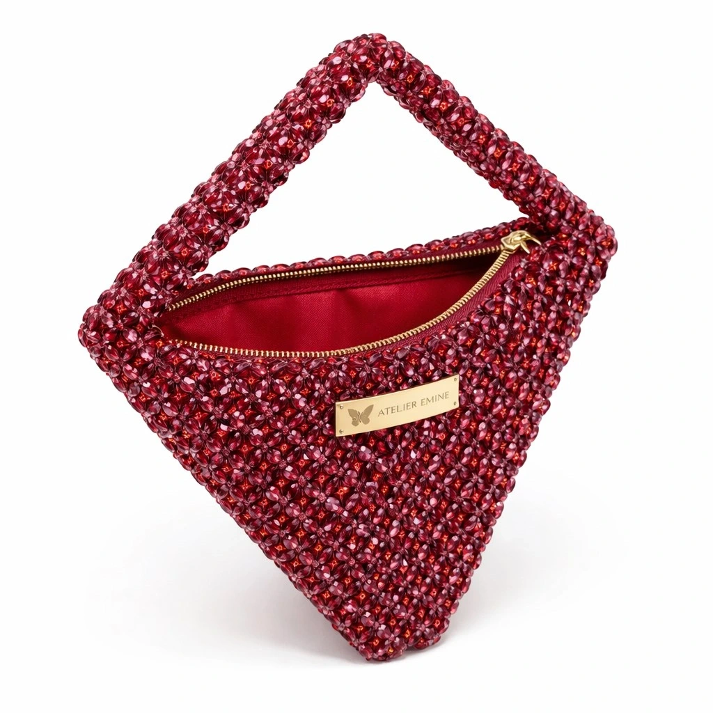 Kristal boncuklar, yüksek dayanımlı misina ile tek tek örülerek simetrik üçgen geometrisini oluşturan rijit bir gövde yapısı meydana getirir. Bu yapı, çantanın keskin hatlı siluetini korurken kristal yüzeyin bütünlüğünü ve yapısal dengesini destekler.