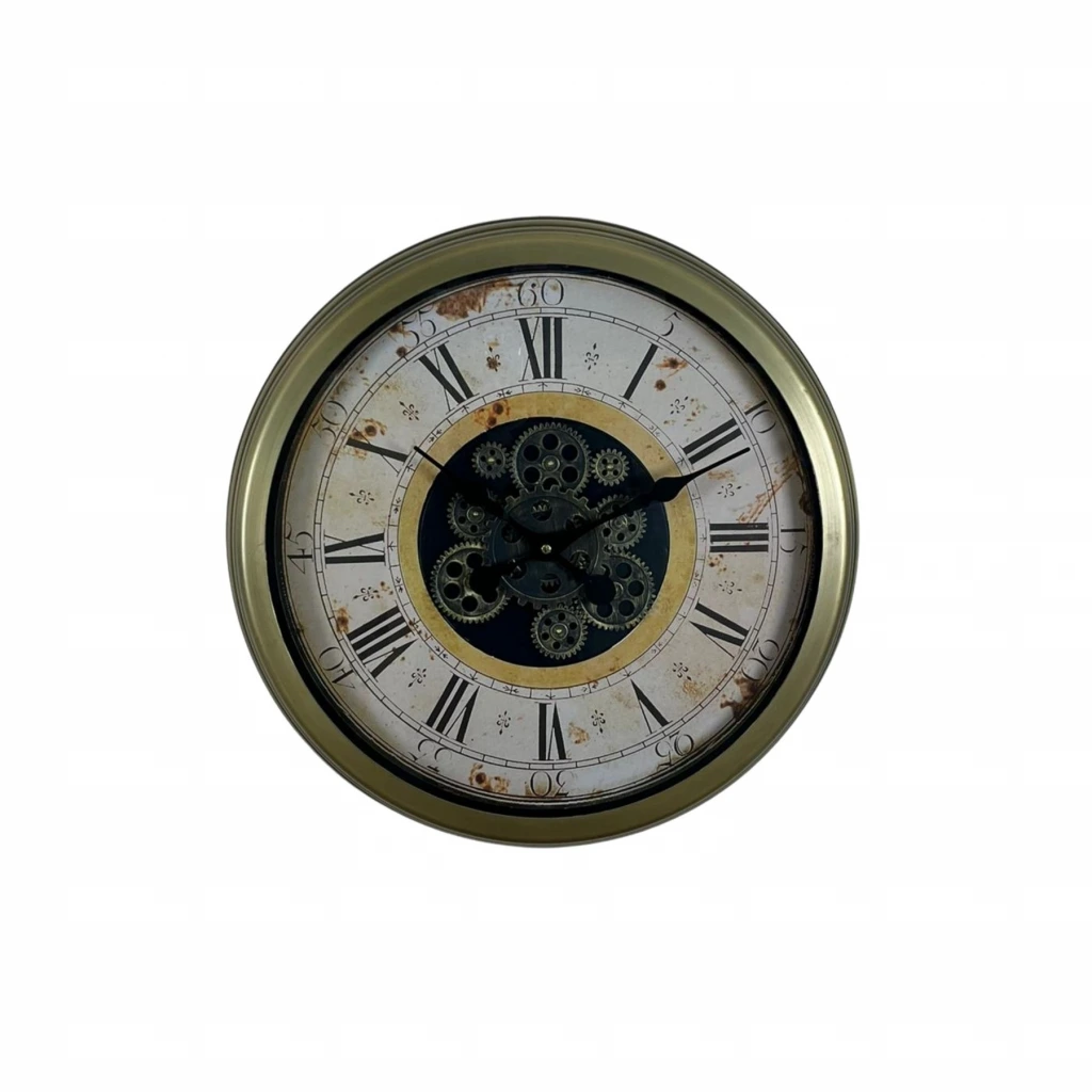 Merkezde konumlanan dekoratif hareketli çark mekanizması, saatin klasik yapısını mekanik bir detayla tamamlar. 60 cm geniş çapı sayesinde özellikle büyük salon duvarlarında, ofislerde, kafe ve restoran dekorasyonlarında güçlü bir odak noktası oluşturur.