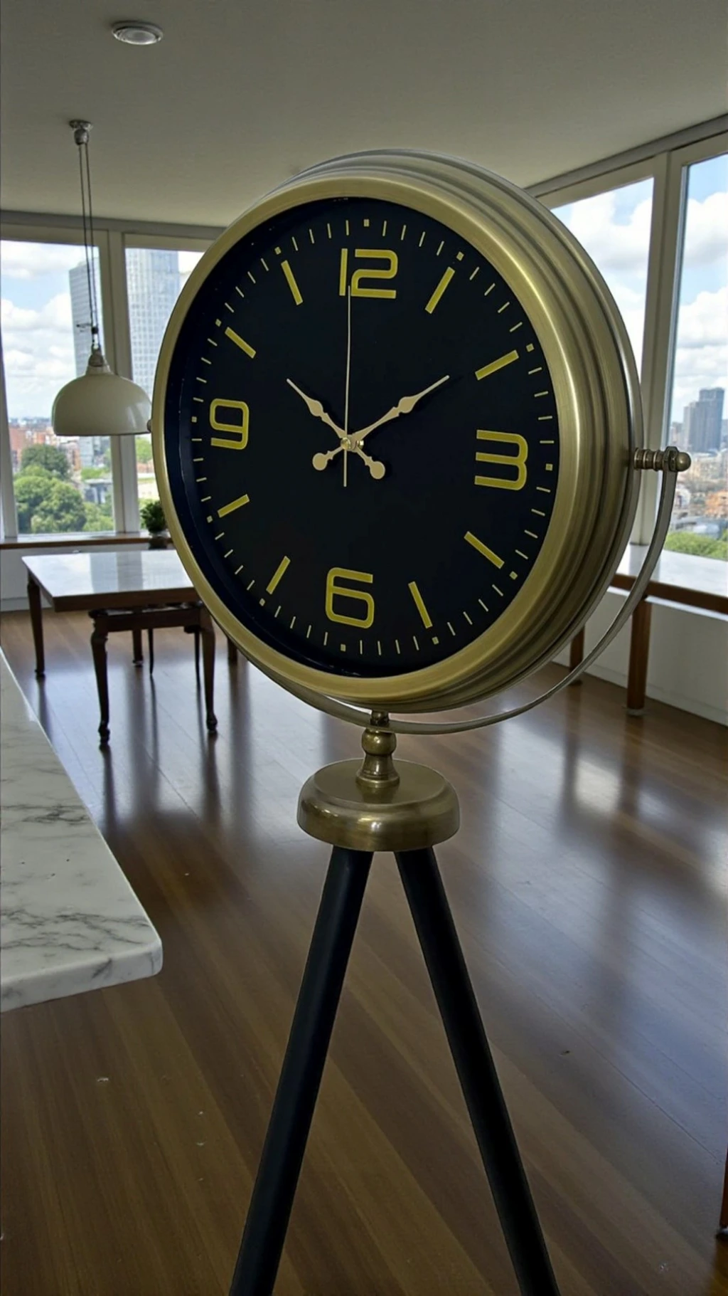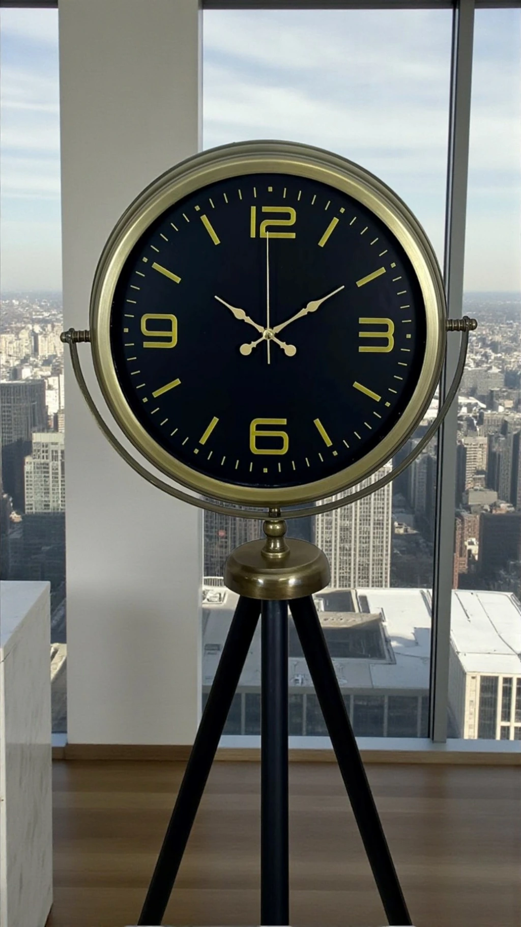 Bu modelin en dikkat çeken yanı; siyah kadran üzerindeki minimal, gold tonlu çizgiler ve zarif rakam detaylarıdır. Gösterişten uzak ama net bir şıklık sunar. Modern klasik, loft, endüstriyel ve çağdaş dekorasyonlarda rahatlıkla kullanılır. Tripod ayak formu ürüne hem dengeli bir duruş kazandırır hem de “vitrinlik” bir görünüm verir. Ofislerde, yönetici odalarında, showroom’larda ve butik işletmelerde konsept dekoru güçlendiren çok iddialı bir tamamlayıcıdır.
